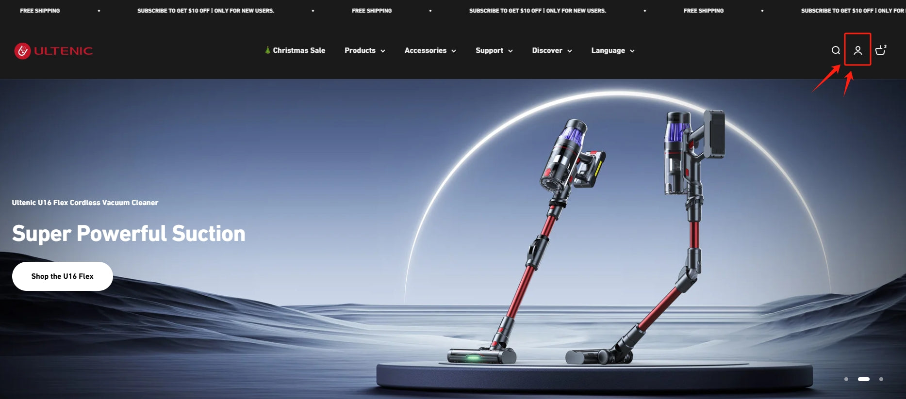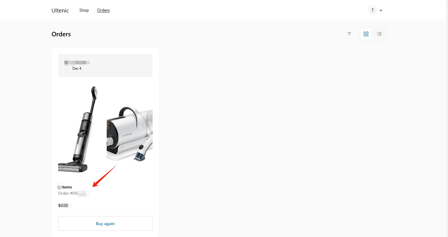 Option 1: Accedi al tuo account sulla homepage e fai clic sull'icona nell'angolo in alto a destra per visualizzare la tua cronologia acquisti e il numero dell'ordine.