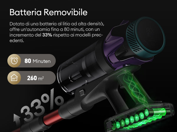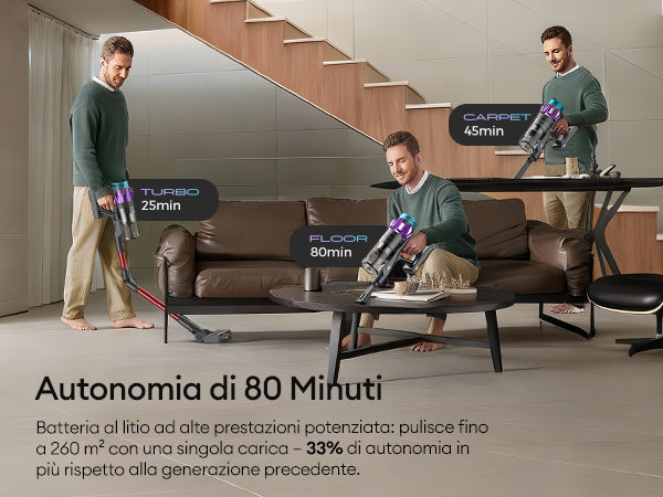 Dotato di una batteria al litio ad alta densità, offre un'autonomia fino a 80 minuti, con un incremento del 33% rispetto ai modelli precedenti. Ideale per abitazioni fino a 260 m², garantisce una pulizia completa e ininterrotta, eliminando ogni preoccupazione legata all'autonomia.