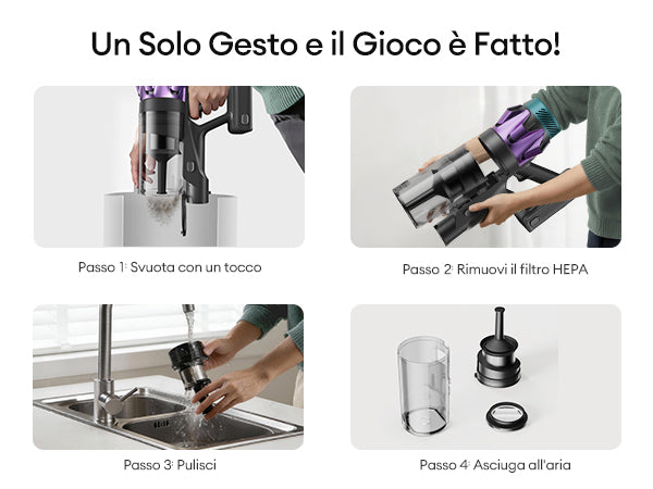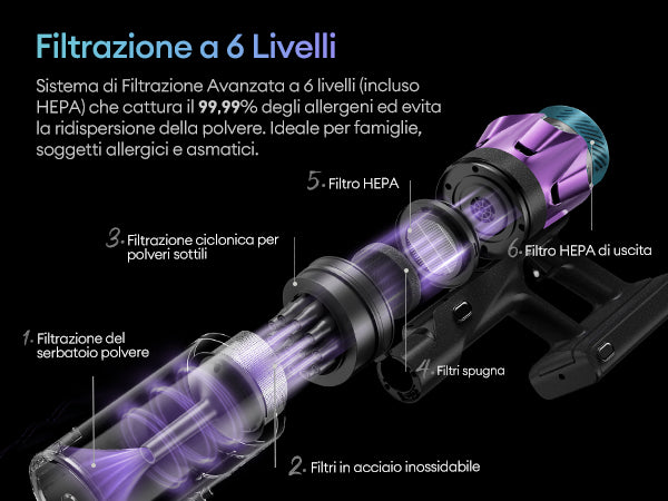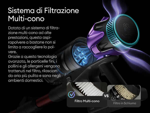 Dotato di un sistema di filtrazione multi-cono ad alte prestazioni, questo aspirapolvere a bastone non si limita a raccogliere la polvere. Grazie a questa tecnologia avanzata, le particelle fini, i pollini e gli allergeni vengono trattenuti nel filtro, rilasciando aria più pulita e sana negli ambienti domestici.