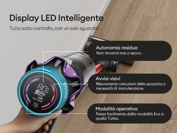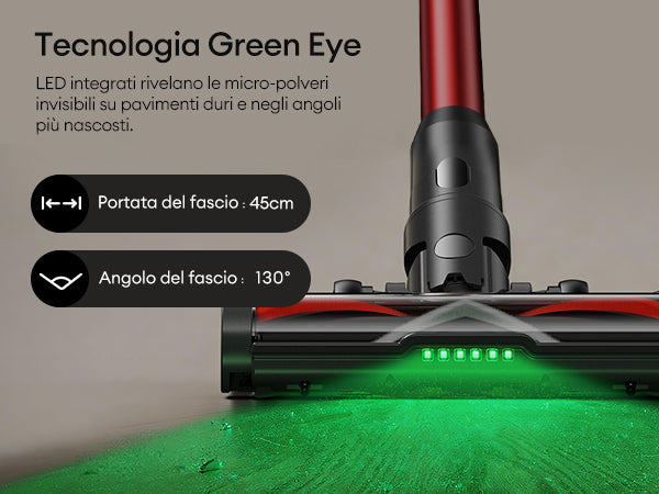 LED integrati rivelano le micro-polveri invisibili su pavimenti duri e negli angoli più nascosti