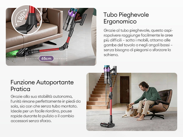 Grazie alla sua stabilità autonoma, l'unità rimane perfettamente in piedi da sola, sia con che senza tubo montato. Ideale per un facile riordino, pause rapide durante la pulizia o il cambio accessori senza sforzo.