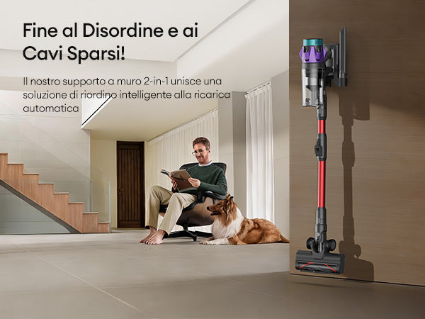 Il nostro supporto a muro 2-in-1 unisce una soluzione di riordino intelligente alla ricarica automatica: